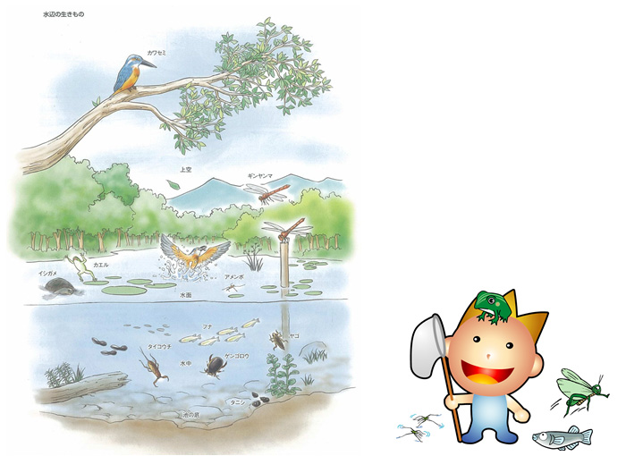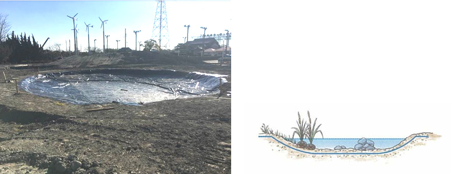 水辺をつくる際には地下に水が逃げないように止水用のシートを敷き、その上に土を被せます。 やがて水際に草が生え、苔や水草も生え、ヤゴなどの昆虫も集まってくると思います。