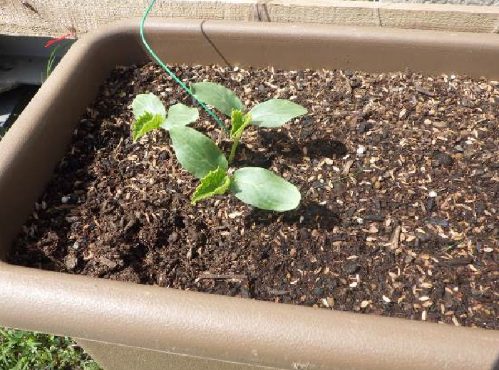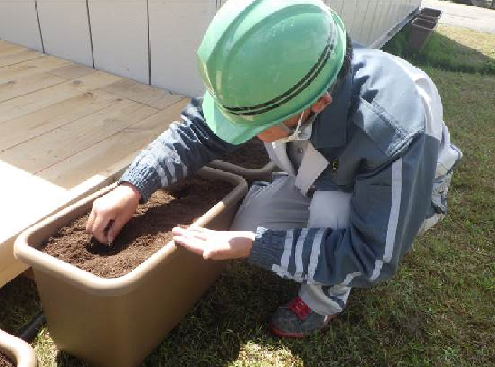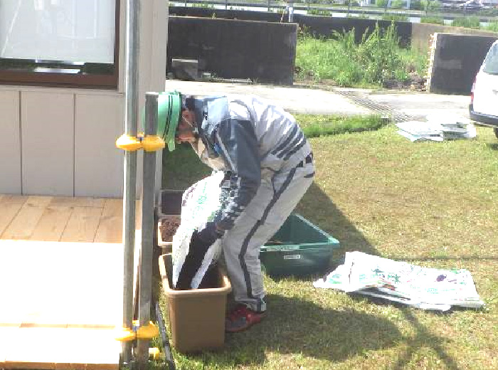 地植えができないので、プランターを使用、作物用の大きめのものです。