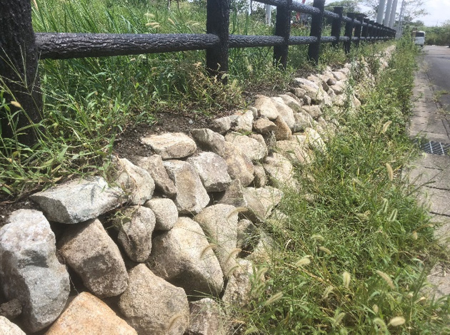たくさんの生きものの隠れ処となるようカトケンビオトープにはわざと隙間を空けた石積みがしてあります。