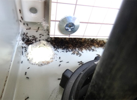 余談ですが、ビオトープに設置されている水質浄化設備の分電盤の中に大量のアリが集まっています。