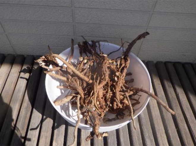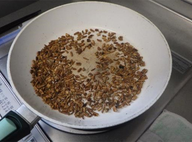今度は乾燥して小さくしぼんで固くなった根をフライパンで焙煎します。