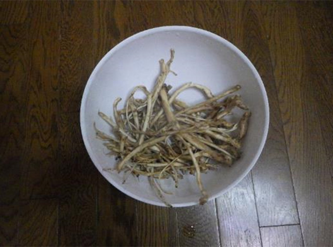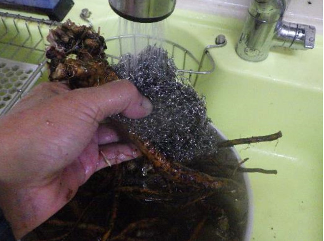 ゴボウのような根っこを、金タワシで、細かい根や皮を落とすように根気よくきれいにしていきます。