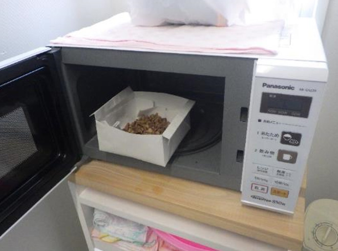キッチンペーパーを敷いた上に刻んだ根を入れ、電子レンジで3分チンします。