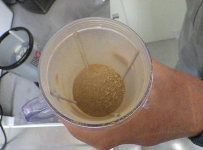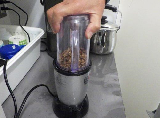 強めのキツネ色になるまで焙煎したら、フードプロセッサーに入れて砕きます。