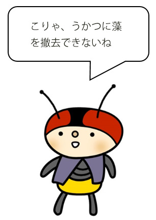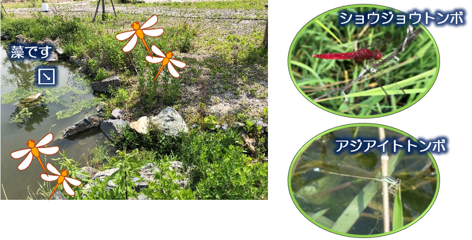 水辺には昨年に引き続き藻が発生してしまっていますが、トンボにとっては大切な産卵の場になっています。