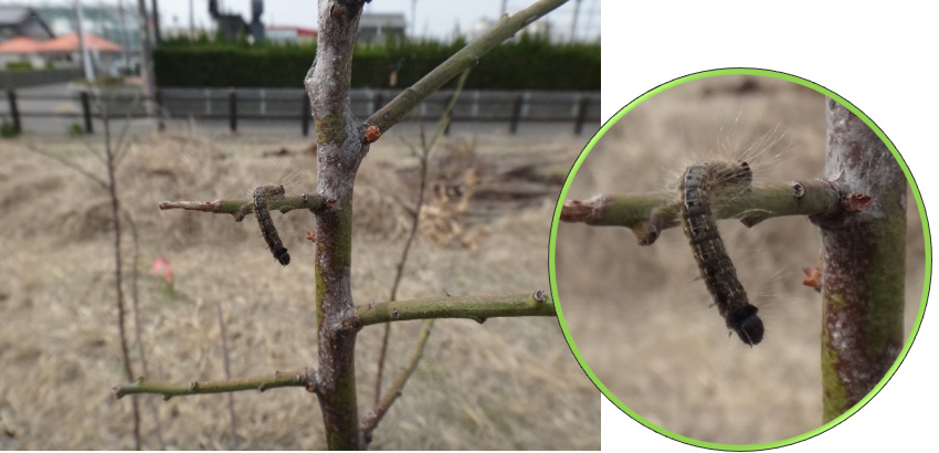まずは梅の葉を全部食べてしまった、オビカレハというガの幼虫です。すごい食欲です。