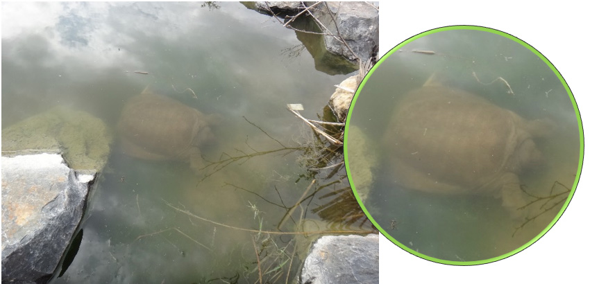 池の中にはスッポンが! かまれないように注意が必要です。
