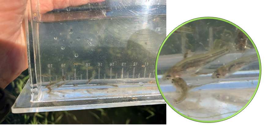 池にはモツゴの稚魚がたくさんいます。