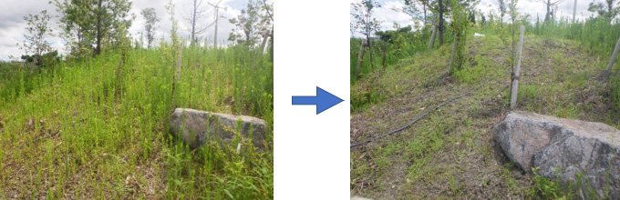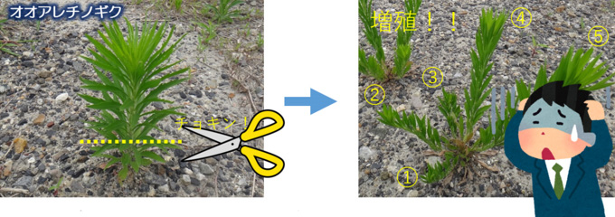 まずは、6月のブログでもお伝えしましたが、草刈り機でカットしたところ増殖してしまった手強い外来植物、オオアレチノギクの駆除を実施しました。