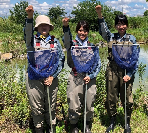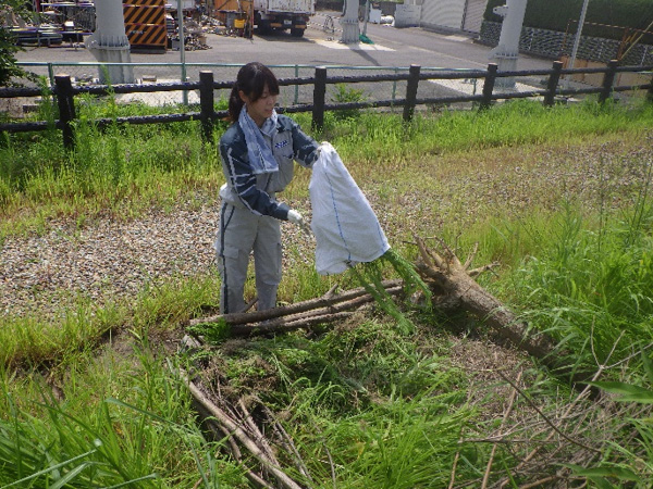 新入社員の女性技術者3名(青山さん、斉藤さん、中根さん)が自然環境を学ぶ研修の一環として、カトケンビオトープで外来種駆除活動を行いました。