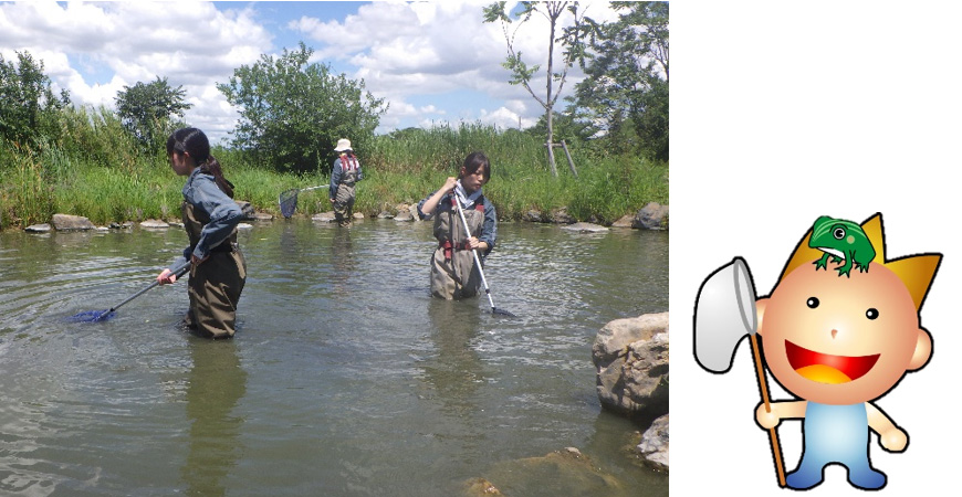 胴長を身に着けて、池にザブン! 池の中でカメを追いかけます。