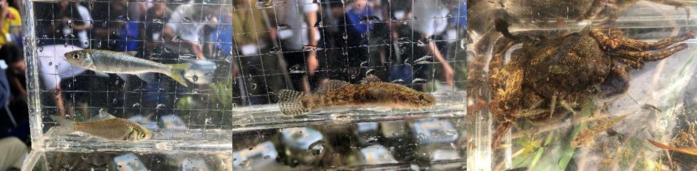 みんな捕まえた生き物に興味津々です。 オイカワや、ヨシノボリ、ウキゴリ、ギンブナ、ドジョウ、ヌマエビ、モクズガニなどなど