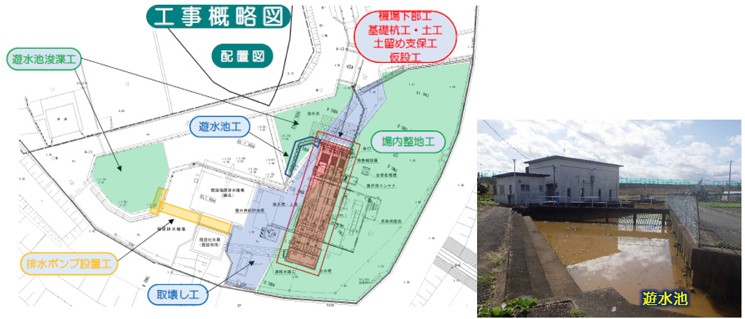 ○○排水機場工事です。古くなって排水能力が低下した排水機場を新しくする工事です。
