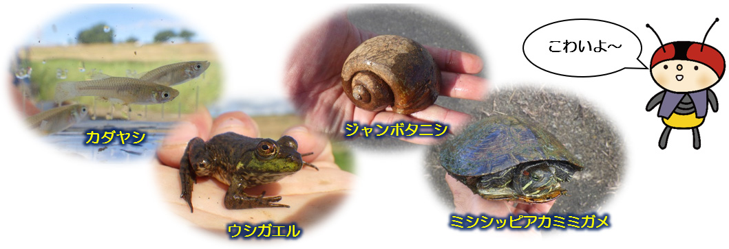 カダヤシ、ウシガエル、ジャンボタニシ、アカミミガメなどの外来種がたくさん…あらら…
