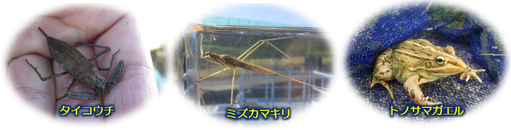 水生昆虫のタイコウチやミズカマキリと近年減少しているトノサマガエル。