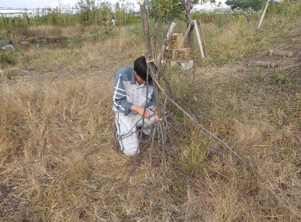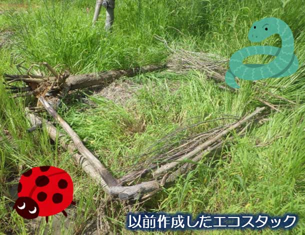 エコスタックとは石や木材を積んだもので、その隙間が生きものの住処となります。