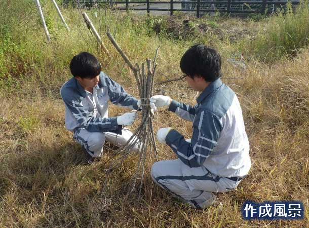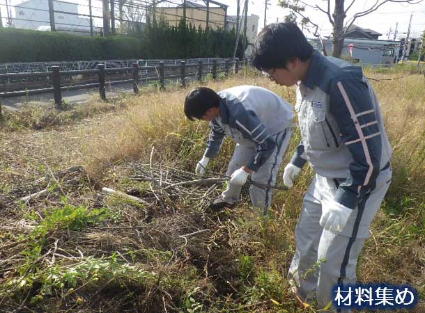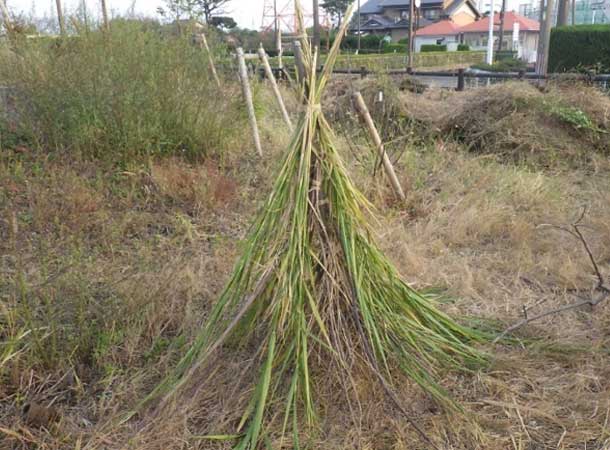 という訳で、まずは材料集め。剪定した際に出た枝や、竹やヨシを切り出して使います。