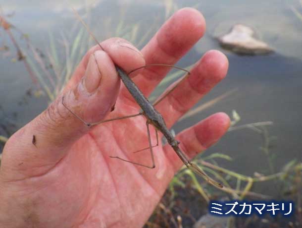 急いで見てみると…ビオトープでは初確認の水生昆虫“ミズカマキリ”がいました! すごい!