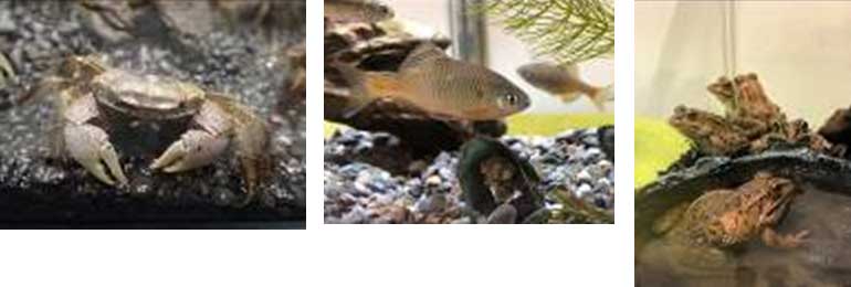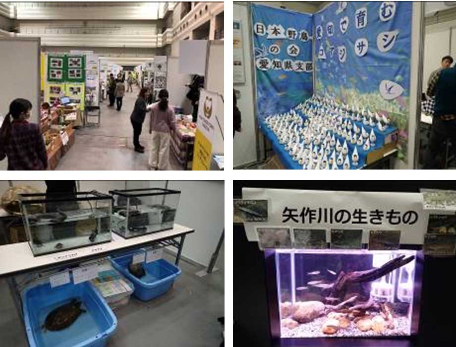 エコミーティングの活動報告や現場で保護したベンケイガニ、淡水魚、ナゴヤダルマガエルなどの生き物を展示♪