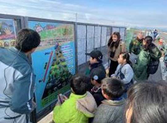 鳥を観察した後は、ウォーターパークの横にある大膳排水機場工事現場の環境掲示板で、生態系ピラミッドについてお勉強です。