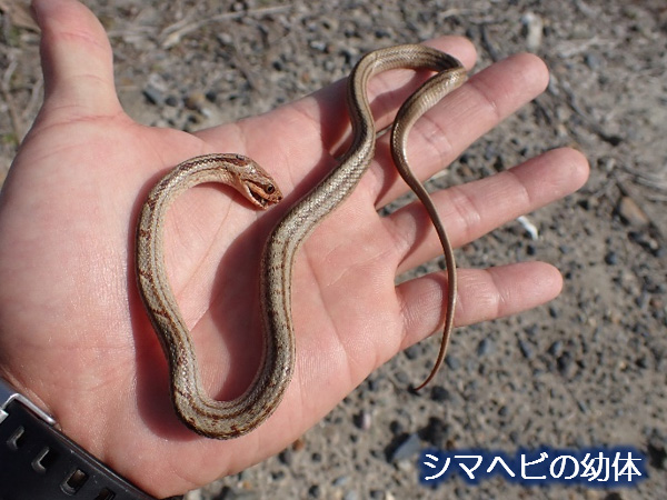そして、カエルの天敵のヘビ(シマヘビの幼体)もいました!