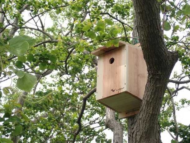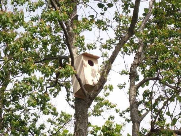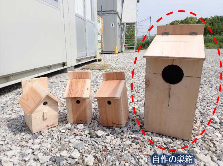 自作してもらった大きな巣箱は「猛禽類」などの大きな鳥を対象としたものです。