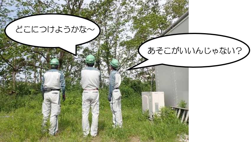 現場事務所の横の木に設置するのですが。さて、どこに設置しようか?