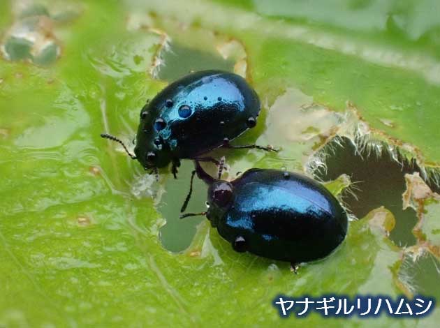 この昆虫は『ヤナギルリハムシ』。名前の通り“ヤナギ“の葉を好んで食べます。