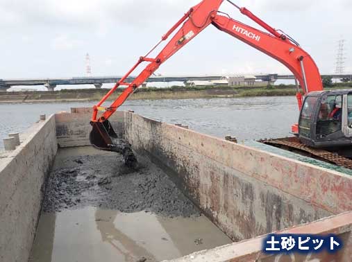 バックホウで土砂を掘削して、台船のピットの中に溜めていきます。