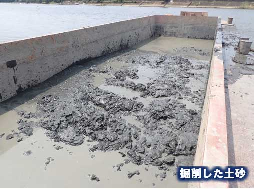 溜まった土砂は、陸に上げてセメントと混ぜて改良土として活用されます。