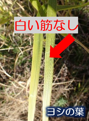葉に注目すると、葉の中央にススキであれば、あるはずの白い筋がありません。