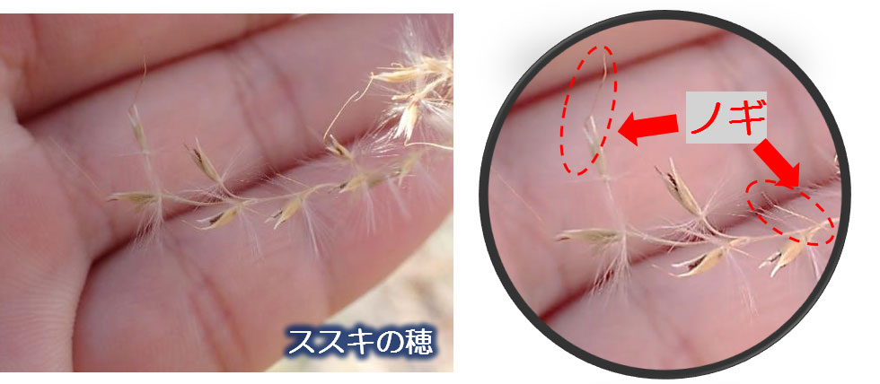 ススキと見分けるポイントは穂の先端にある「ノギ」という毛があるかどうか。