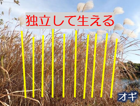 下の写真を見ると分かるように、オギは1本1本が独立して生えているのに対して、