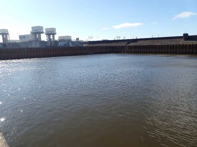 水の中にあるコンクリートを取り壊すために水を抜くようです。