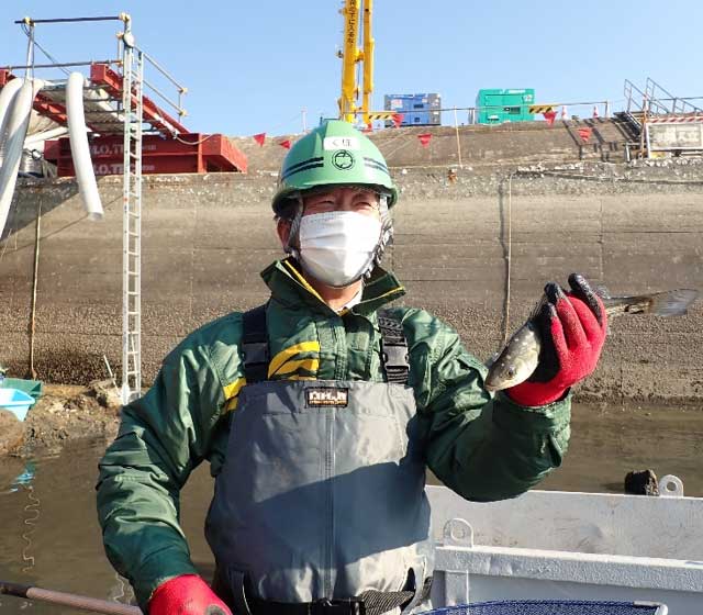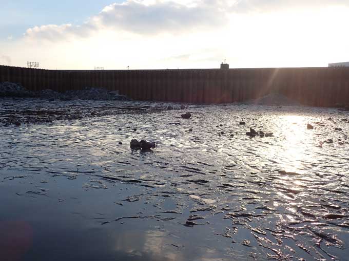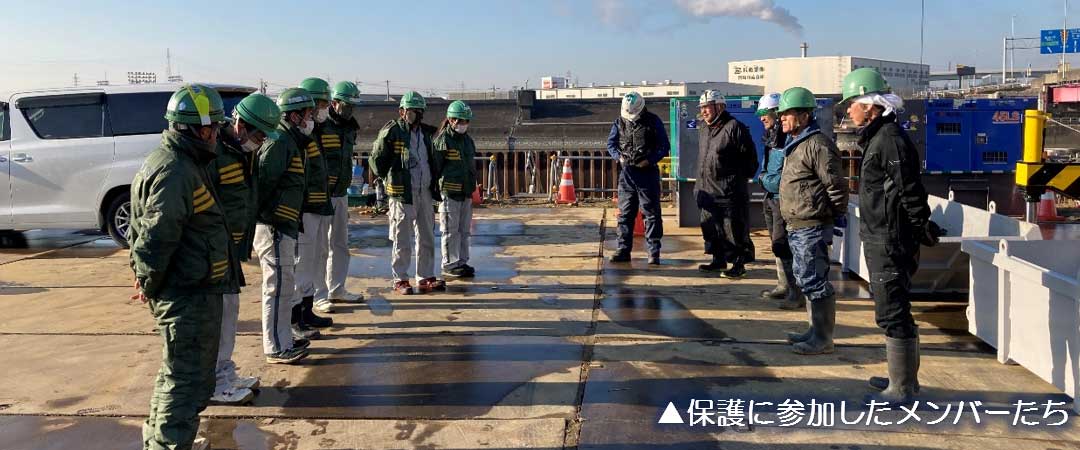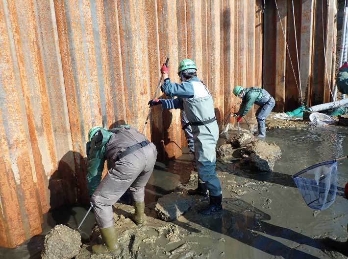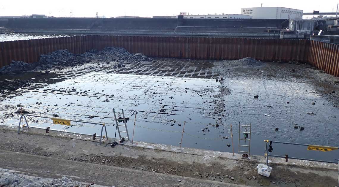 この現場は河口にある古い水閘門の基礎を撤去する工事で、