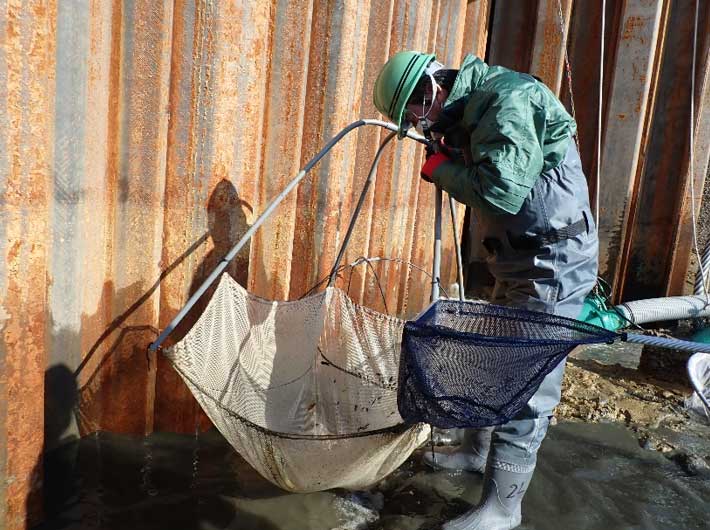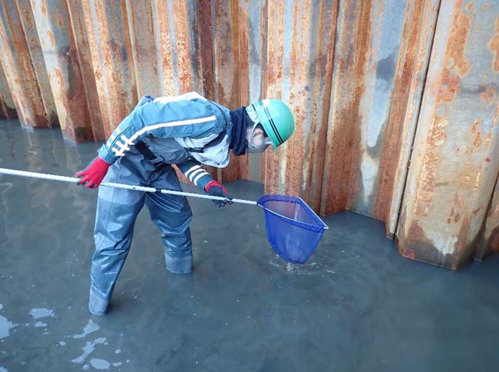 水の溜まっている深みやポンプの周りを重点的にたも網で探ります。