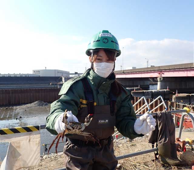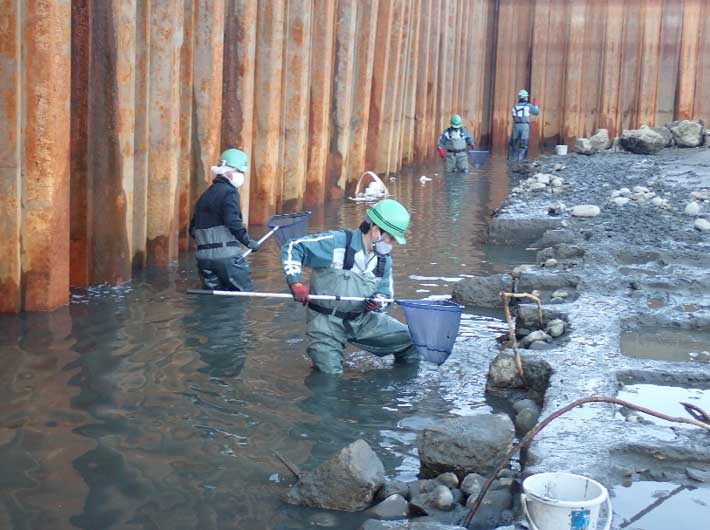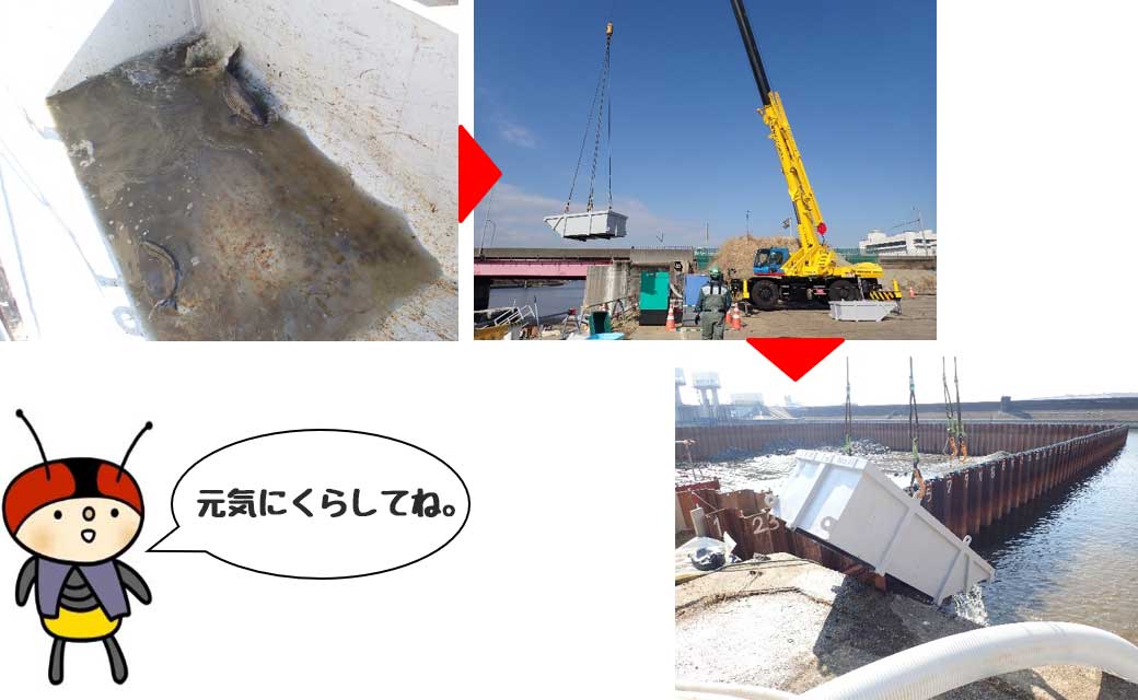 保護した生き物たちはベッセルに入れて、クレーンで吊り上げてもらい川へ放流しました。