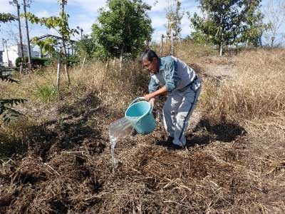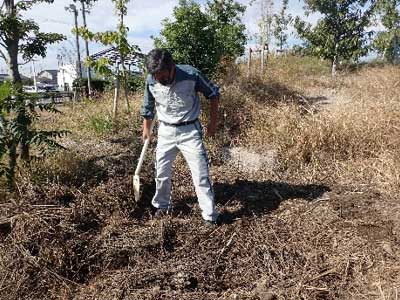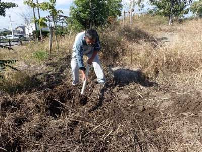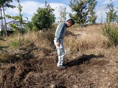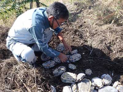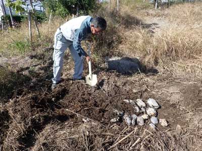 ③配置したカメの上に腐葉土→枯れ草の順に被せ、踏み固める。