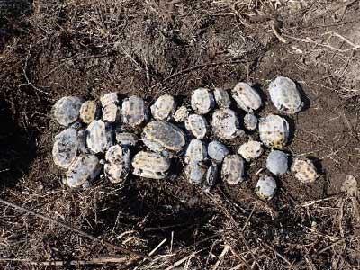 ②出来た土台に、冷凍処理したカメを重ならないように配置する。