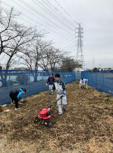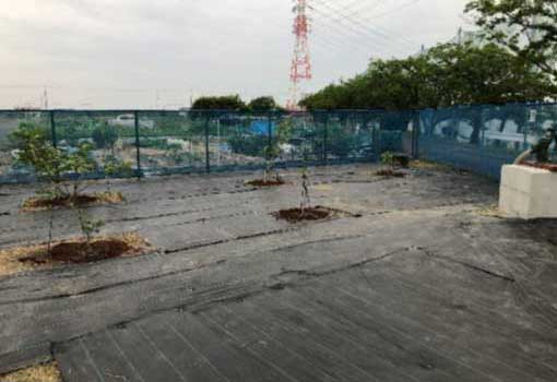 防草シート張り、木の周りの除草、幹に培養土を散布、