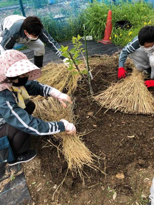 株の周辺全体を土が見えないように稲わらで覆いました。
