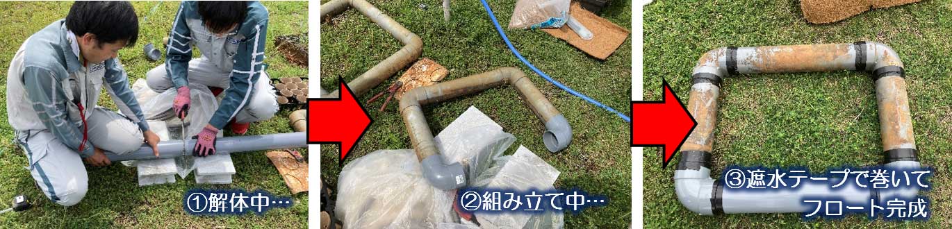 ③塩ビ管の中に水が入らないように、つなぎ目を遮水テープでグルグル巻きにして
