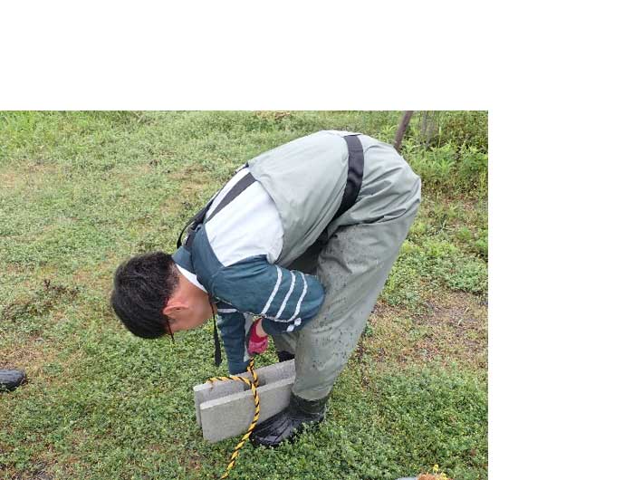 コンクリートブロックをアンカーとしてつけ、池に着水させます!!