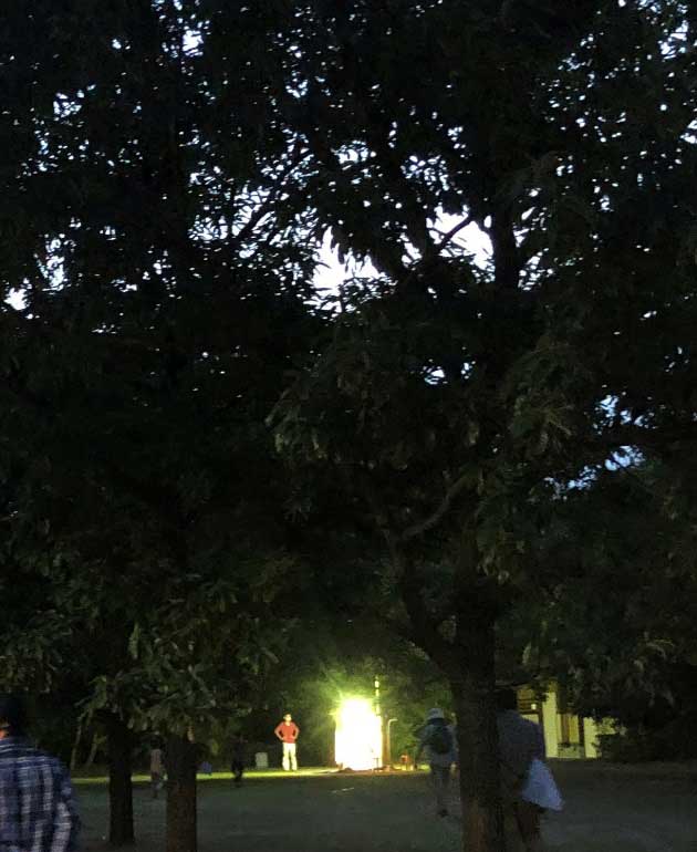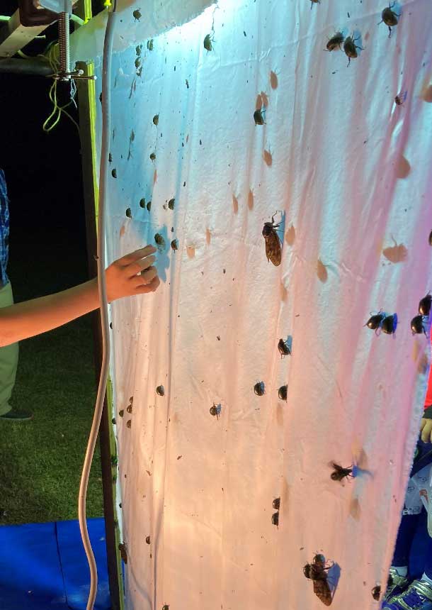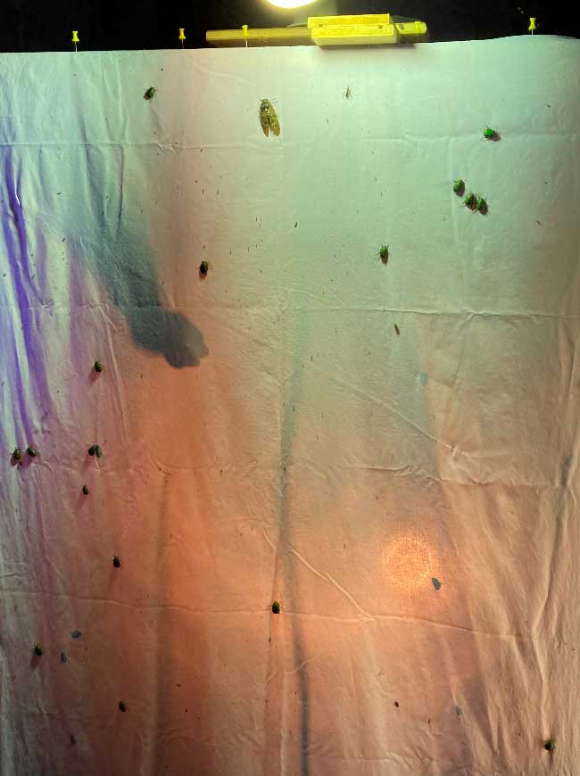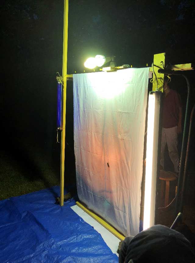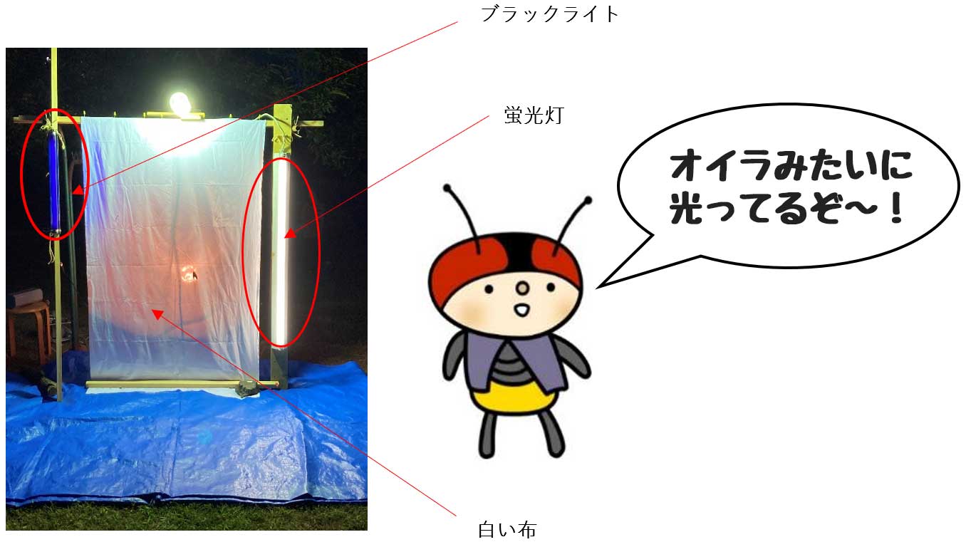 今回の昆虫調査は、「ライトトラップ」に群がる昆虫を採集するため、夜に行われました。