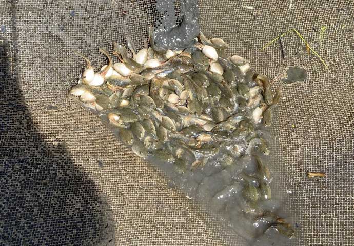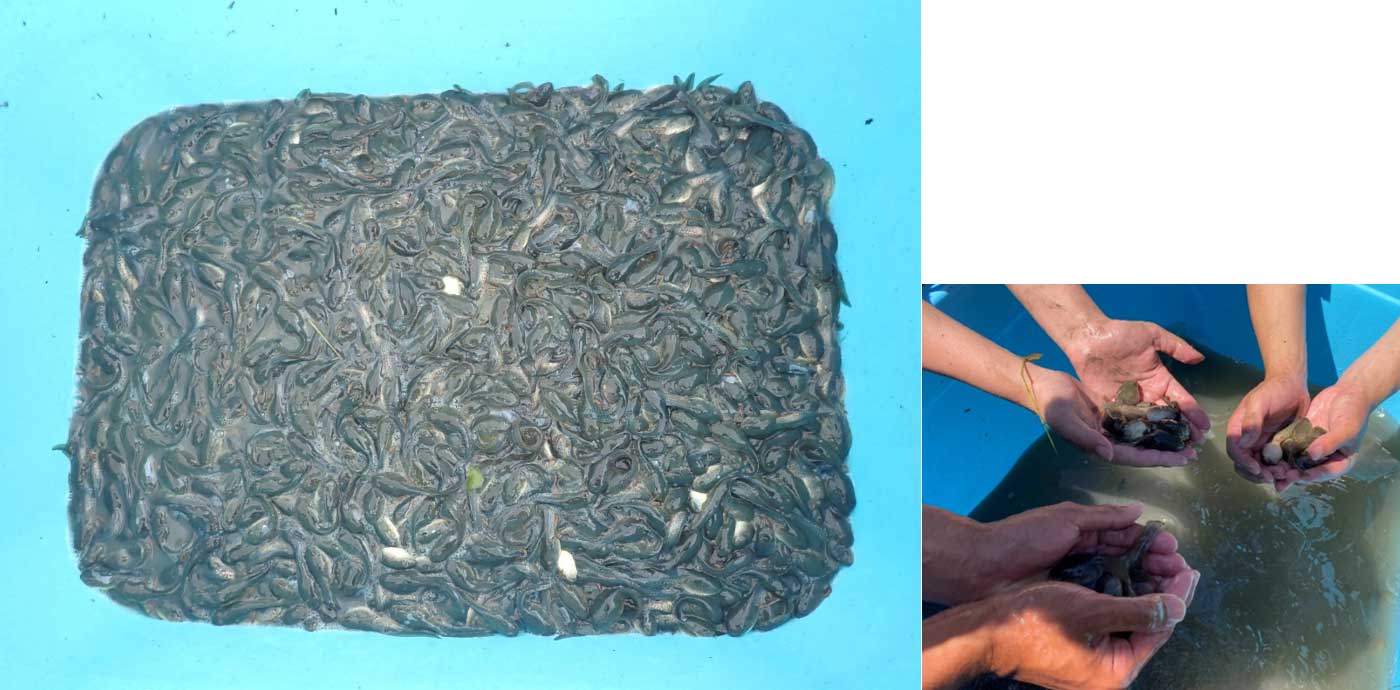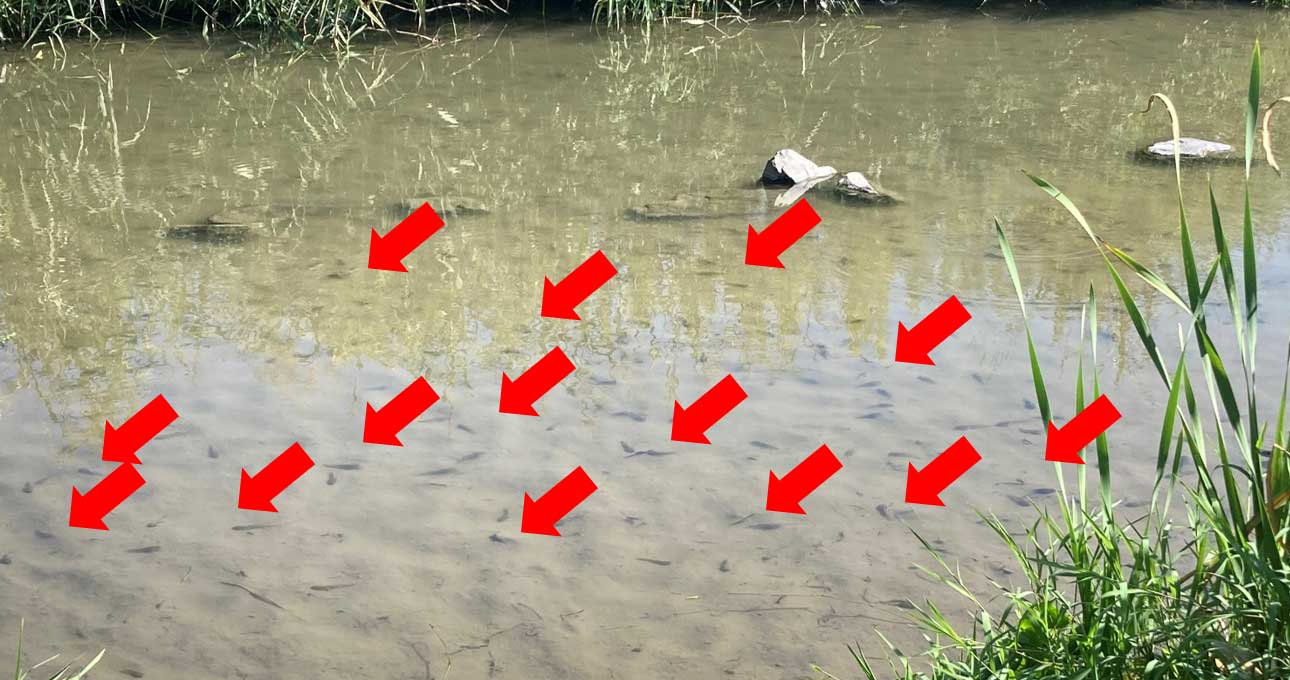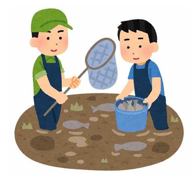 この時、たも網でガサガサしたり、水面を叩いて音を出したりして、