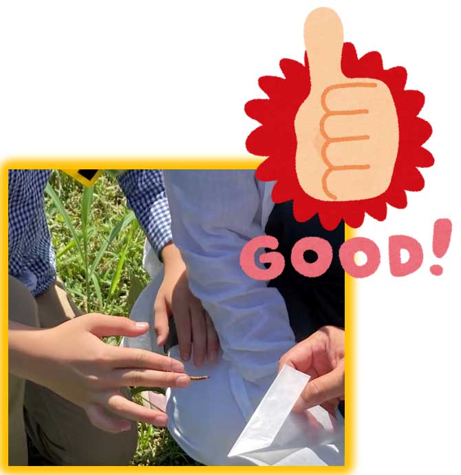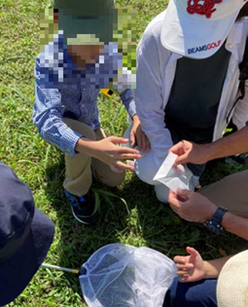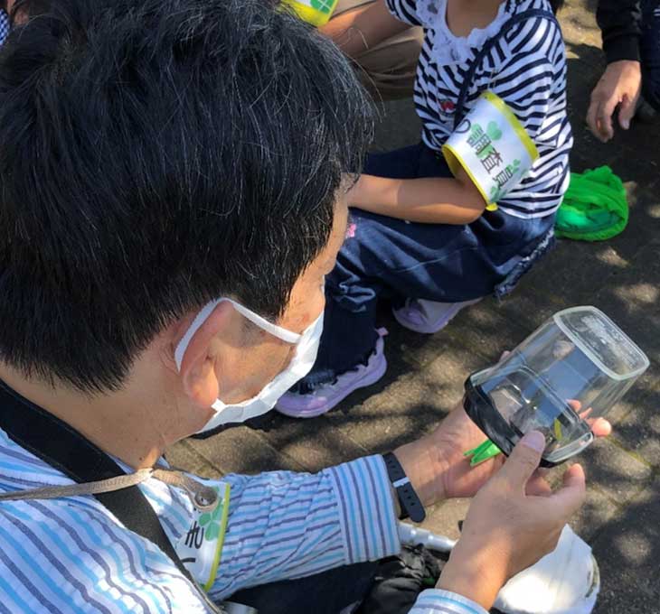 「いきもの調査員」の腕章をして、虫取り網などを持っていると、
