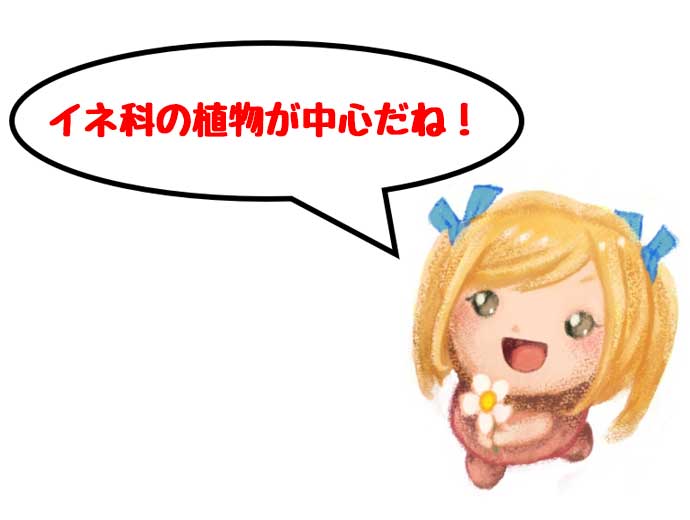 エノコログサ、キンエノコロ、メヒシバ、チカラシバ、チガヤ。
