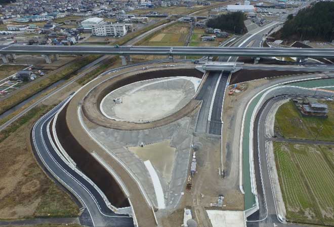 完成している構造物の高さにあわせて土を盛り、道路をつなげていきます。