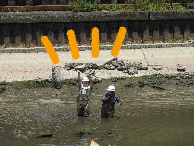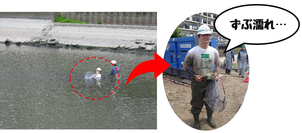 捕獲班がタモをもって川へ突入!(頼もしい背中…)