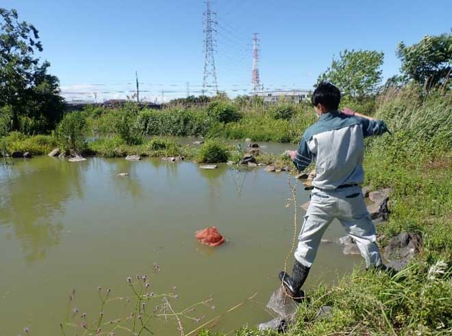 魚が集まりそうな場所に、餌を入れた罠を沈めて1日置いて待ちます。